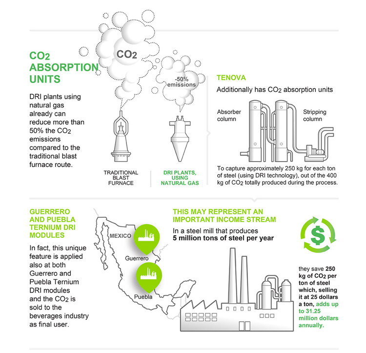Tenova is leading the way towards a more sustainable steel manufacturing worldwide. DRI plants using natural gas already can reduce more than 50% the CO2 emissions compared to the traditional blast furnace route, but the company additionally has CO2 absorptions units to capture approximately 250 kg for each ton of steel (using DRI technology), out of the 400 kg of CO2 totally produced during the process. In fact, this unique feature is applied also at both Guerrero and Puebla Ternium DRI modules and the CO2 is sold to the beverages industry as final user.